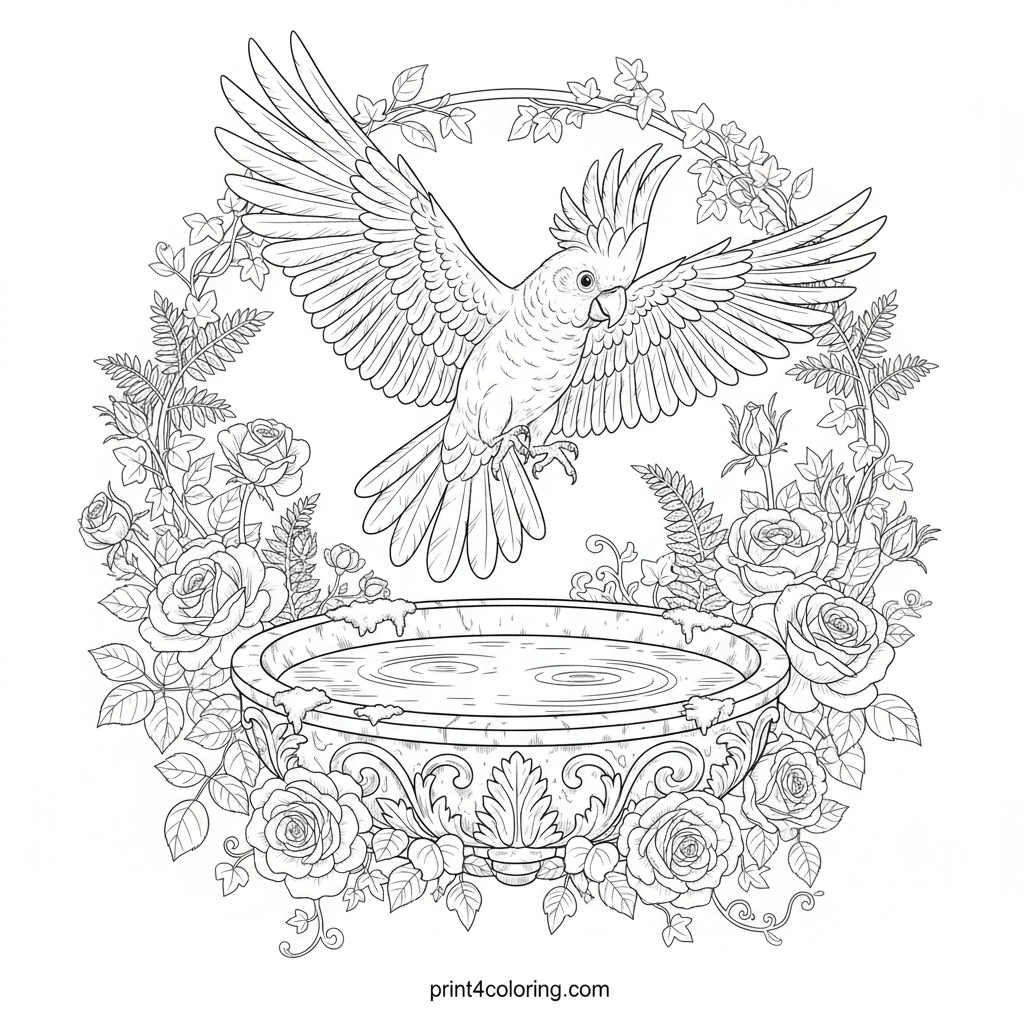 #cockatoo#parrot#secret-garden#bird-bath#vintage-roses#nature#detailed#garden#coloring-page#printable