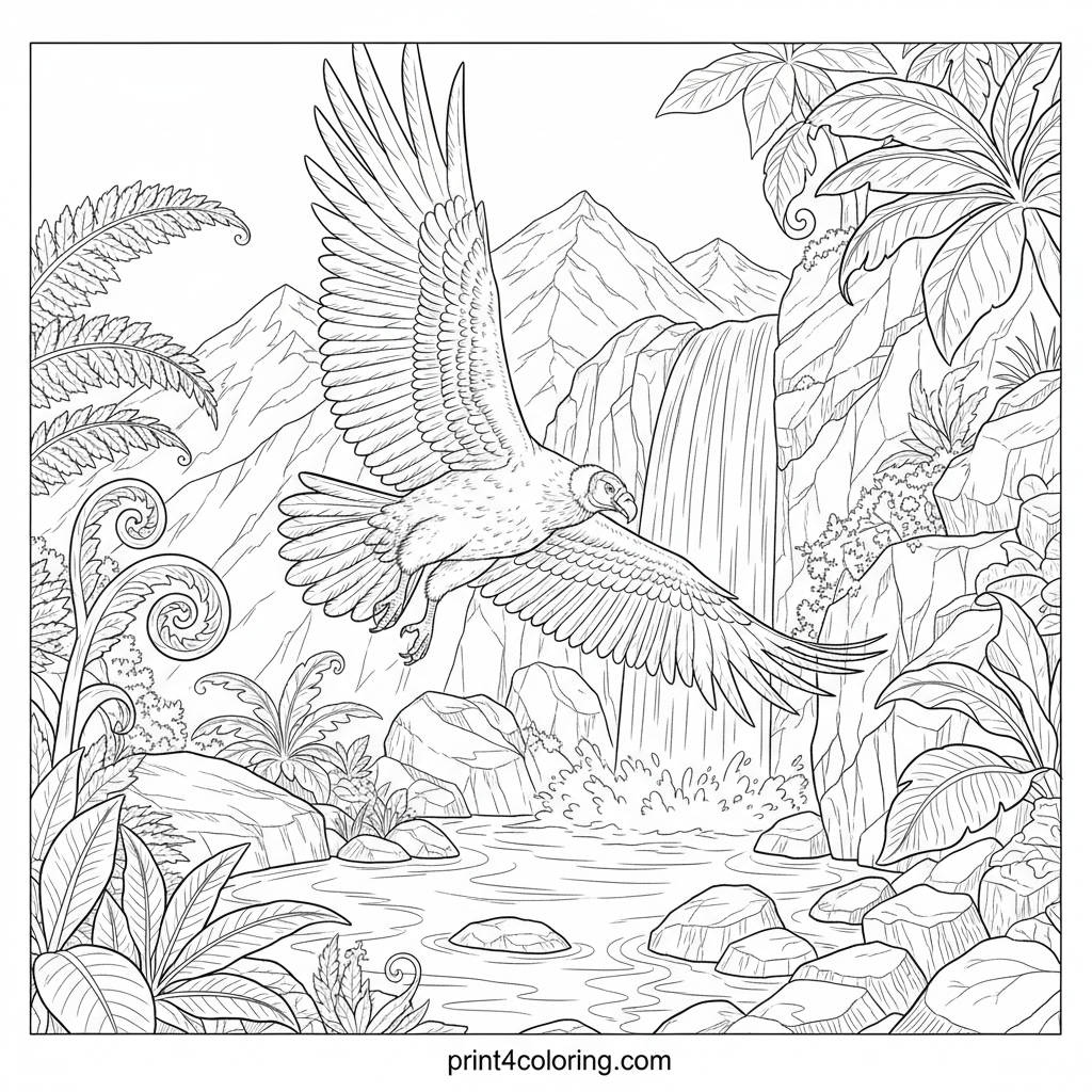 Majestic Condor's Secret Waterfall Discovery Coloring Page