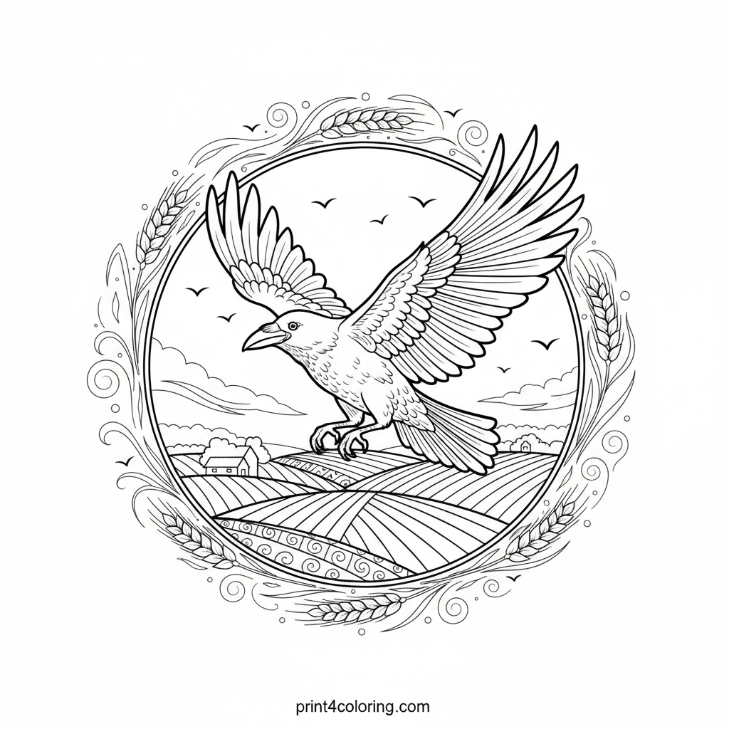 Majestic Crow Soaring Over Golden Fields Coloring Page