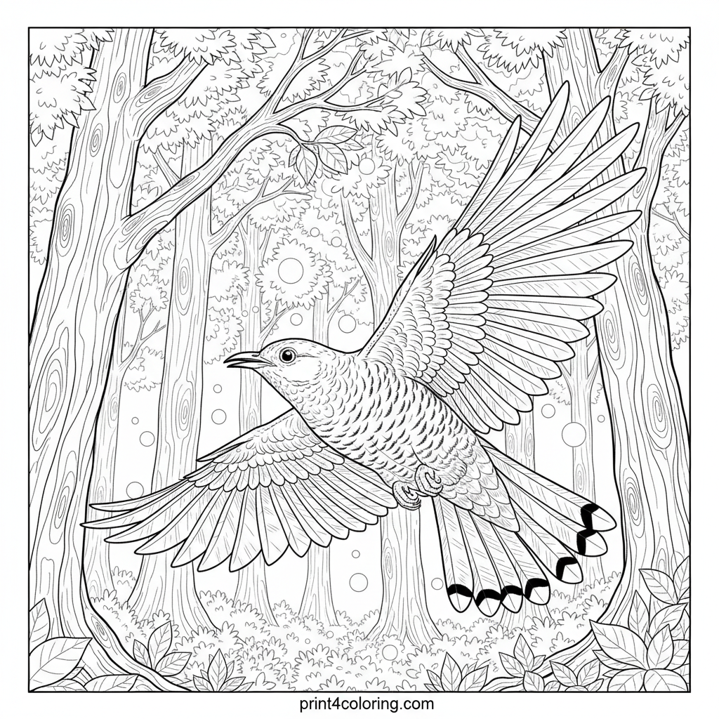 Soar with a magnificent cuckoo as it glides gracefully through an ancient, sun-dappled forest. Its wings are wide open, showcasing every intricate feather detail amidst the tall trees and shimmering light. A breathtaking scene ready for your vibrant colors!