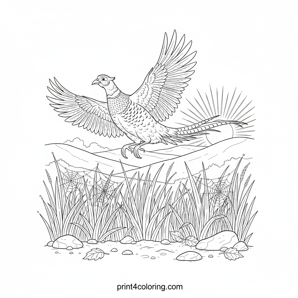 Imagine a stunning male pheasant soaring into the sky, wings wide open, just as the sun peeks over the horizon. Its beautiful feathers are caught mid-flight, rising from a meadow sparkling with dew and delicate spiderwebs. A truly magnificent scene ready for your expert colors!