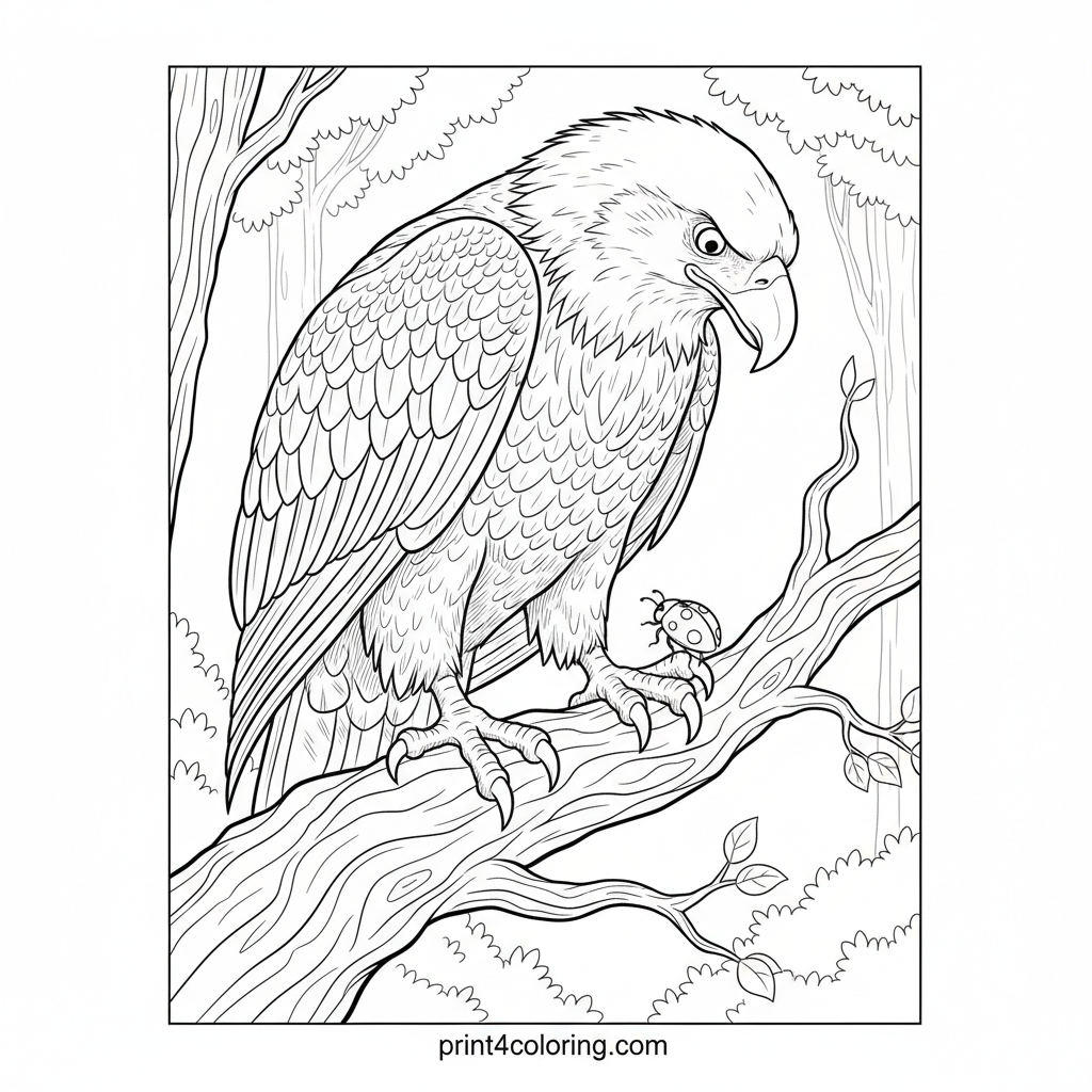 A magnificent eagle perches regally on a thick branch, its keen gaze fixed on an unexpected guest! A tiny ladybug slowly climbs one of its strong talons, creating a moment of subtle surprise. Expert colorists will love bringing this unique encounter between a majestic bird and its minuscule friend to life.