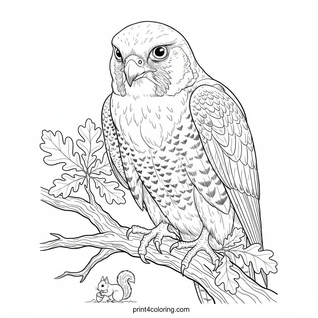 Observe the stunning detail of a regal falcon, perched majestically on an ancient oak branch. Its keen eyes are fixed on a busy squirrel burying an acorn below. This intricate scene invites you to explore the beauty of nature, from the textured bark and delicate leaves to the tiny forest treasures. A challenging and rewarding coloring adventure awaits!