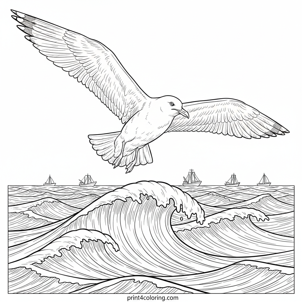 Majestic Flight: Seagull Over Ocean Waves Coloring Page
