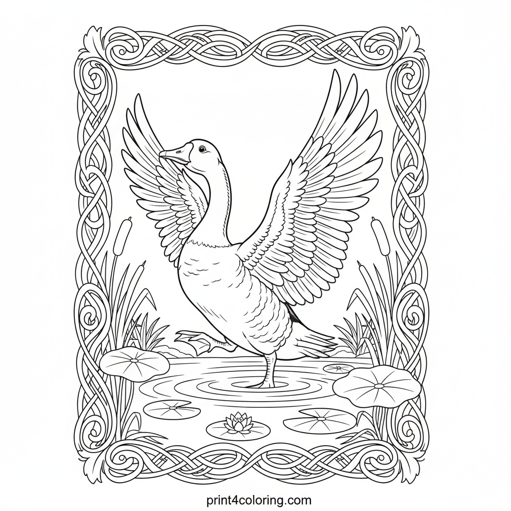 Witness the power and grace of a magnificent goose as it takes flight! This expert-level coloring page captures every intricate feather and strong muscle as the goose lifts off from a serene pond, creating gentle ripples. Bring this dynamic scene to life with your most vibrant colors and detailed shading.