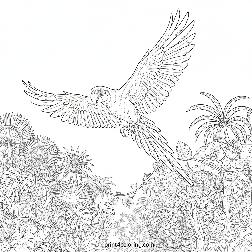 Soar with a magnificent macaw as it glides gracefully above the vibrant tropical rainforest canopy! This detailed scene invites you to bring to life its brilliant feathers, the intricate leaf shapes, and the hanging vines of its lush home. A challenging adventure for expert colorists!