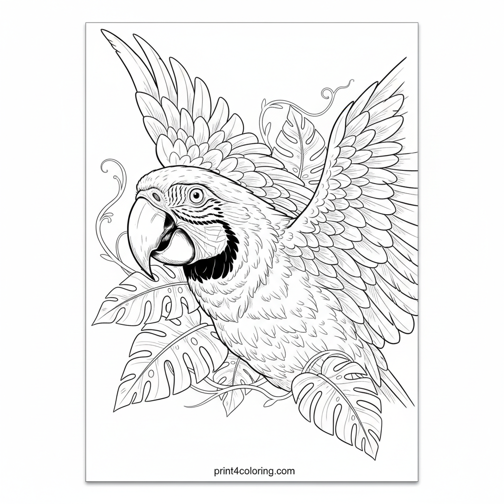 A vibrant macaw takes center stage, wings spread wide, as it glides through the dense rainforest canopy. Imagine the colors you'll use for its feathers and the lush green leaves! This detailed scene invites you to bring the magic of the jungle to life with every stroke.