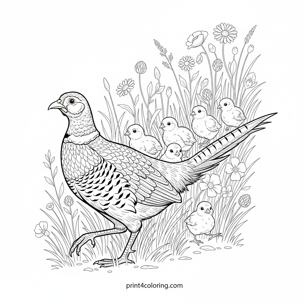 Join a majestic mother pheasant as she gracefully guides her adorable, fluffy chicks through a vibrant field. Watch the tiny chicks peek out from the tall grass and colorful wildflowers, exploring their world under her watchful eye. This intricate scene offers a delightful coloring challenge for nature lovers.