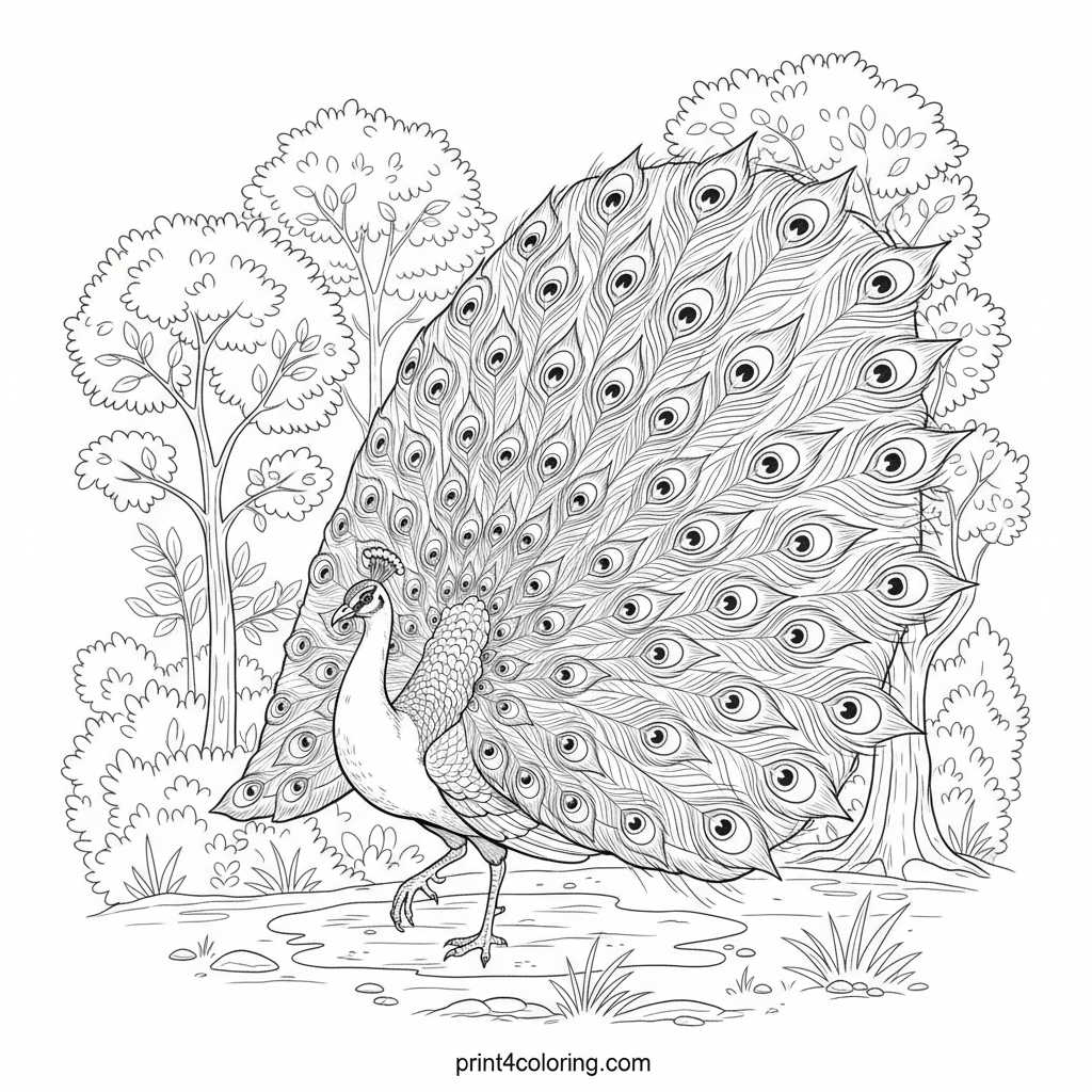 Behold the breathtaking beauty of a majestic peacock in full display! Its enormous, detailed tail feathers fan out in a spectacular arc, showcasing every shimmering 'eye' spot. This proud bird stands on textured ground amidst lush trees, ready for your artistic touch to bring its royal colors to life.