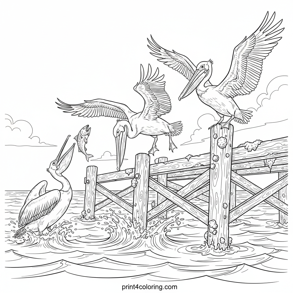 Majestic Pelicans on the Old Pier Coloring Page