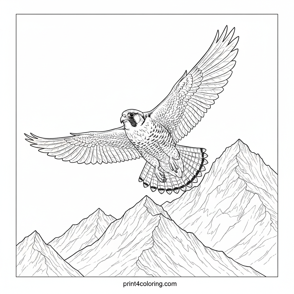 Witness the incredible power and grace of a peregrine falcon as it soars majestically above towering, rugged mountain peaks. This dynamic scene captures intricate feather details and the vastness of the sky, offering a thrilling coloring adventure for nature lovers.