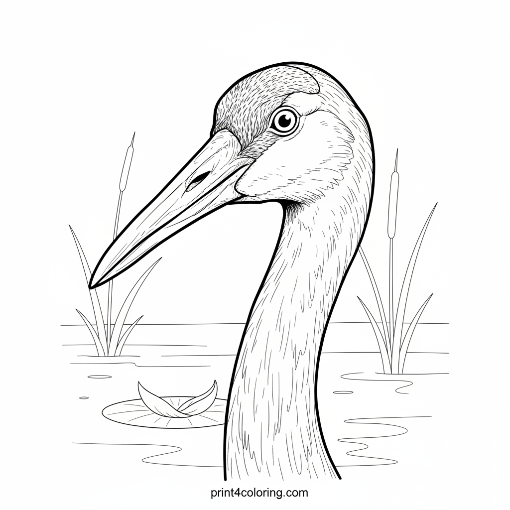 Dive into the tranquil world of a graceful Sandhill Crane with this expert-level coloring page. Capture every detail of its long legs, intricate feathers, and sharp beak as it stands peacefully amidst tall reeds and serene water. Add vibrant colors to the floating water lilies and bring this majestic wetland scene to life.