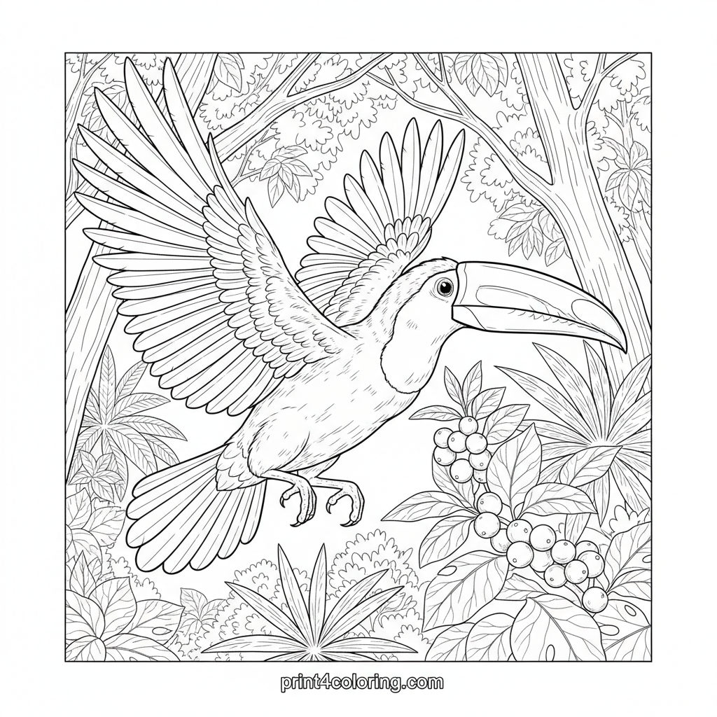 Soar into the heart of the rainforest with this magnificent toucan! Watch as it glides gracefully through dense trees, wings spread wide, on its way to a delicious cluster of ripe berries. Bring this vibrant jungle scene to life with your most colorful crayons and pencils!