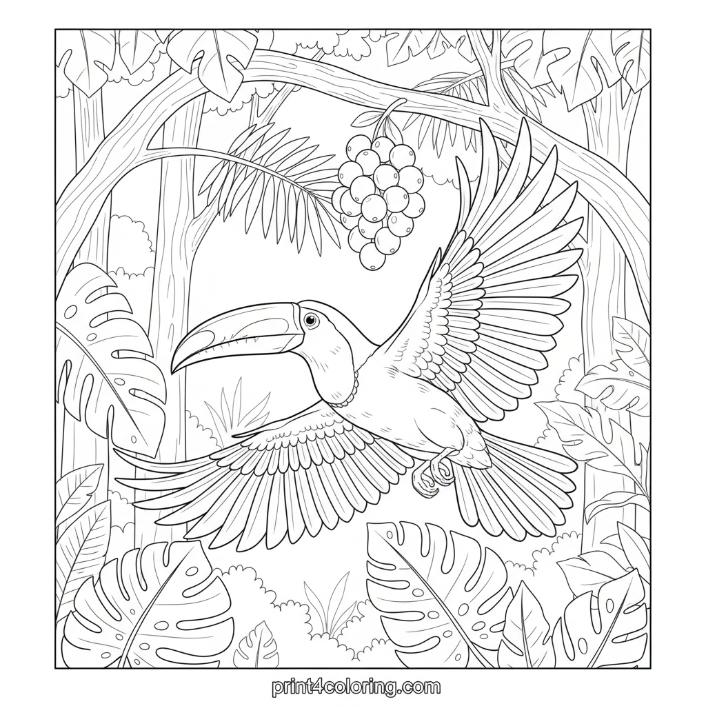 Soar into the vibrant heart of the rainforest with this magnificent toucan! Watch as it glides gracefully through lush jungle trees, its large beak guiding it towards a delicious cluster of ripe berries. This detailed scene invites you to bring the exotic beauty of tropical nature to life with your brightest colors.
