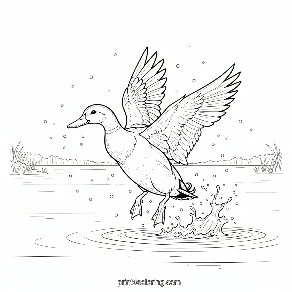 Witness a powerful mallard duck captured mid-flight, wings fully spread as it lifts off from a clear lake. Water droplets spray realistically around, creating a dynamic scene perfect for expert colorists. This detailed page invites you to bring the energy and beauty of nature's motion to life with your vibrant colors.