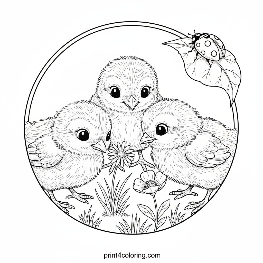 Meadow Explorers: Fluffy Chicks and a Ladybug Friend Coloring Page