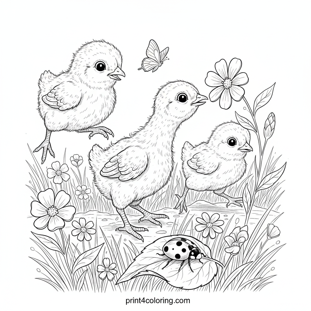 Meadow Explorers: Fluffy Chicks & Ladybug Friends Coloring Page