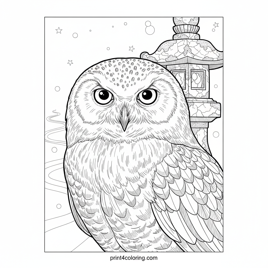 Moonlit Guardian: Snowy Owl's Lantern Path Coloring Page