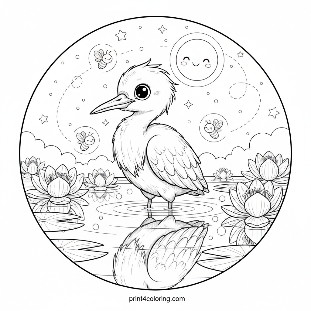 Step into a tranquil moonlit world! An elegant heron gracefully stands in a peaceful pond, its reflection shimmering. Friendly fireflies twinkle around its head, while luminous water lilies float, mirroring a smiling moon and distant stars. A serene scene perfect for expert colorists.