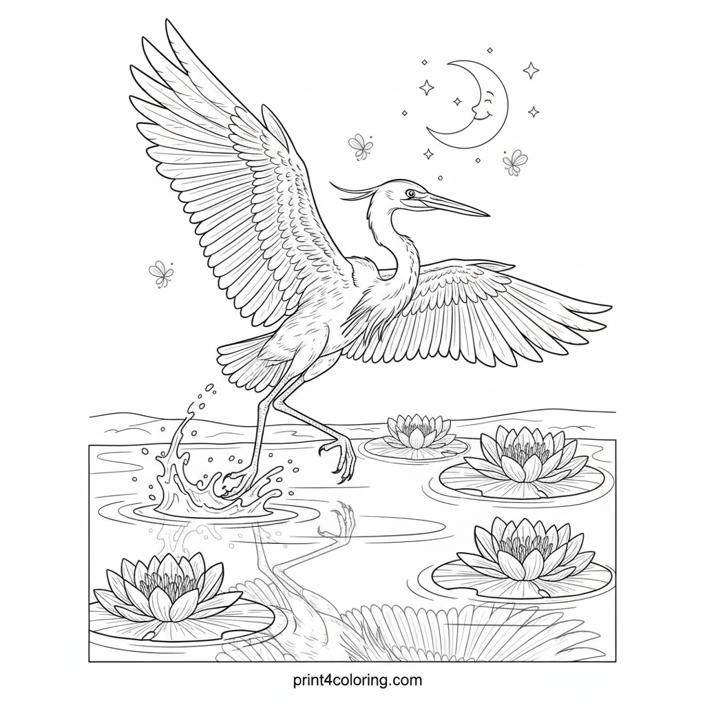 Observe a majestic heron in a serene moonlit pond, its reflection shimmering perfectly on the water. Delicate fireflies softly glow around its head, while luminous water lilies float gracefully. A friendly moon and distant stars complete this magical night scene, offering a beautiful challenge for detailed coloring.