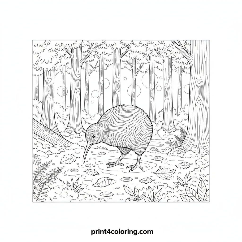 Journey deep into a New Zealand forest at night, where a detailed kiwi bird diligently searches for tasty treats. Moonlight gently peeks through the canopy, illuminating intricate tree trunks, fallen leaves, and lush undergrowth. This expert-level page invites you to bring the magic of the nocturnal forest to life with your colors.