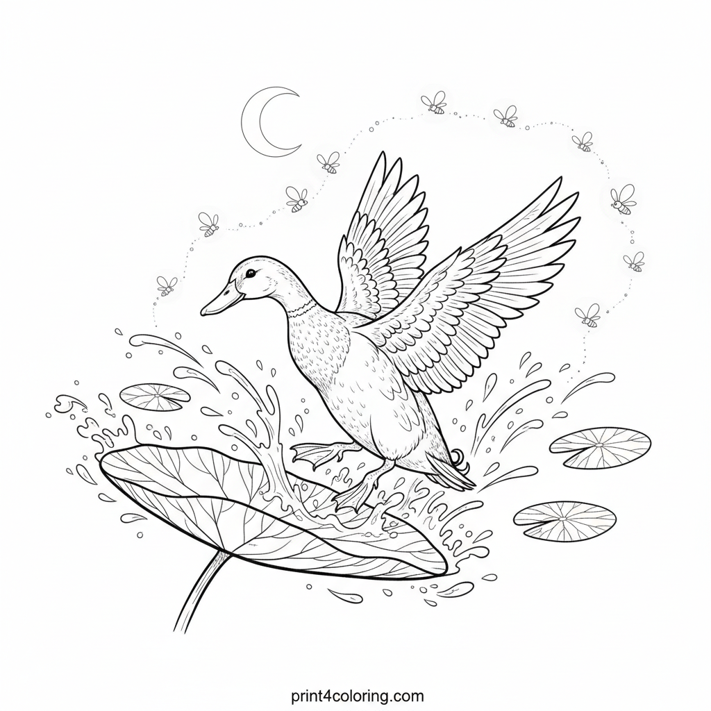 Dive into a serene night scene where a peaceful duck rests on a grand, detailed lily pad. The gentle moonlight casts a soft glow, while magical fireflies twinkle and dance around the shimmering water. This intricate scene invites you to add vibrant colors to its tranquil beauty.