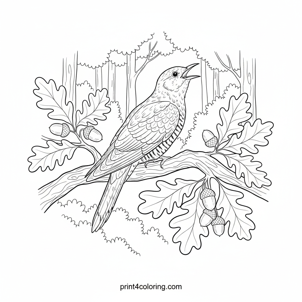 Capture nature's beauty with this intricate coloring page! A magnificent cuckoo serenades the forest from its sturdy oak branch, adorned with detailed leaves and acorns. Sun-dappled foliage in the background offers a challenge for expert colorists, inviting you to bring this lively morning scene to life.