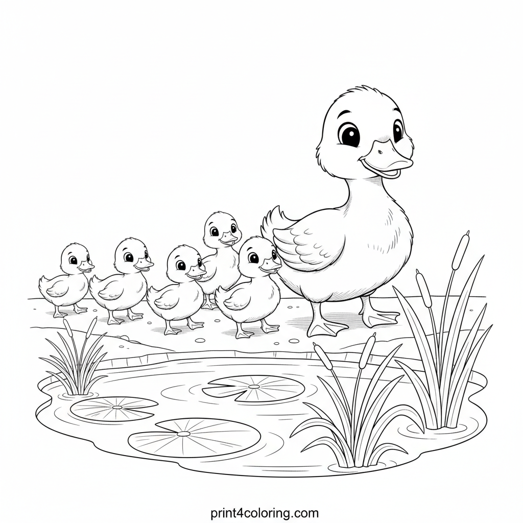 Join a heartwarming scene as a proud mother duck leads her adorable, fluffy ducklings in a perfect single file line towards a peaceful pond. This charming coloring page features intricate details like tall reeds and beautiful lily pads, creating a serene natural setting. A cozy duckling adventure awaits your vibrant colors!