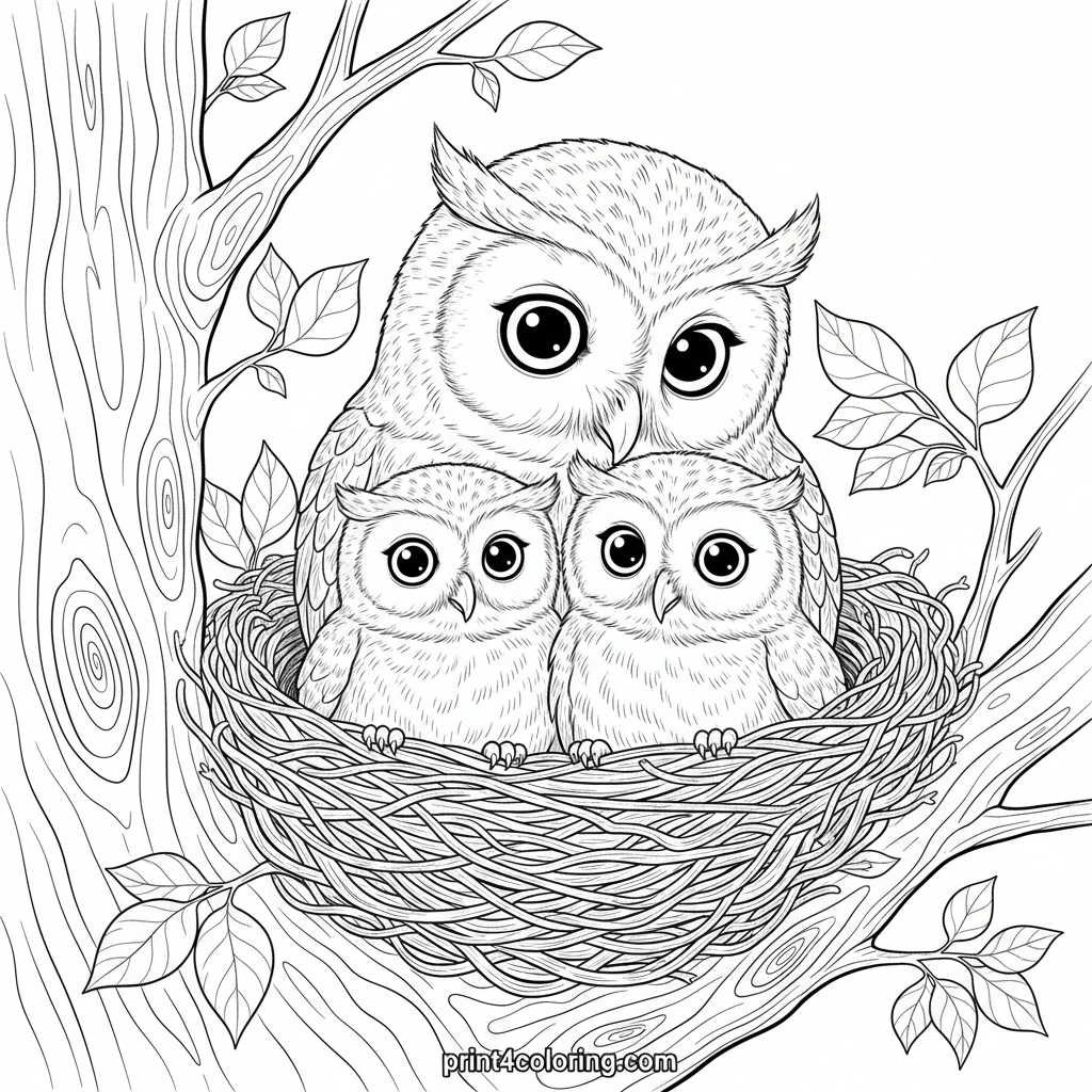 Step into a heartwarming scene with a wise mother owl and her two fluffy owlets nestled securely in their tree home. Watch as she gently cares for her young, surrounded by intricate tree bark and detailed leaves. A perfect moment of nature's love to bring to life with your colors.
