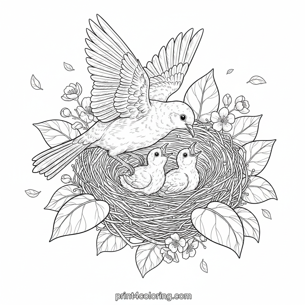 Discover a tender scene of a gentle mother dove lovingly feeding her two fluffy chicks in their cozy, twig-built nest. Surrounded by soft green leaves and delicate blossoms, this heartwarming image invites expert colorists to capture the intricate details and vibrant beauty of nature's care.