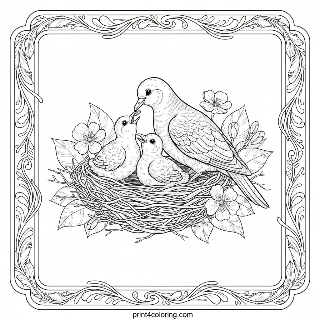 Discover a heartwarming scene of nature's care! A gentle mother dove lovingly feeds her two fluffy chicks, safe within their detailed twig nest. Lush green leaves and delicate blossoms frame this peaceful family moment, inviting expert colorists to bring it to vibrant life.
