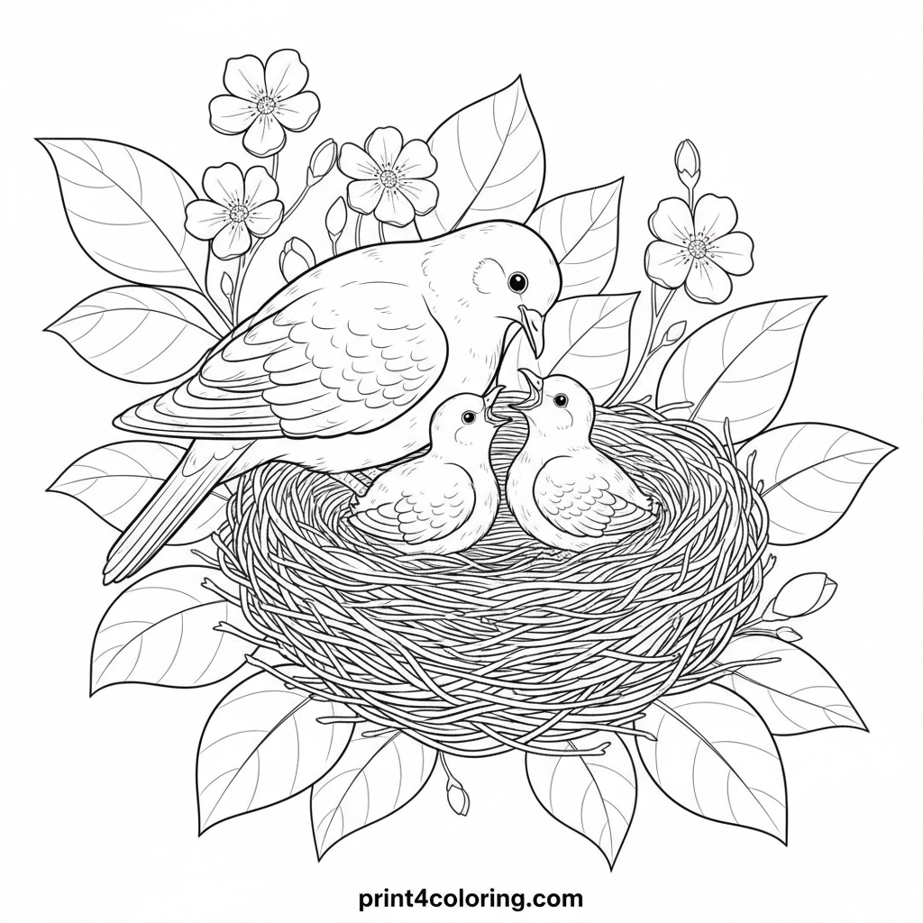 Discover a heartwarming scene of a mother dove tenderly feeding her two adorable, fluffy chicks. They are snuggled safely in a beautifully detailed, twig-built nest, surrounded by lush green leaves and delicate blossoms. Bring this peaceful moment to life with your favorite colors and create a masterpiece of nature's care.