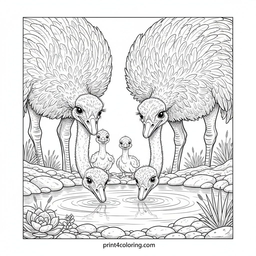 Gather your colors for a captivating close-up of an ostrich family! A majestic male and a watchful female, alongside their adorable chicks, carefully quench their thirst at a tranquil desert waterhole. Bring to life the detailed feathers, smooth river stones, and unique desert plants surrounding them in this expert-level scene.
