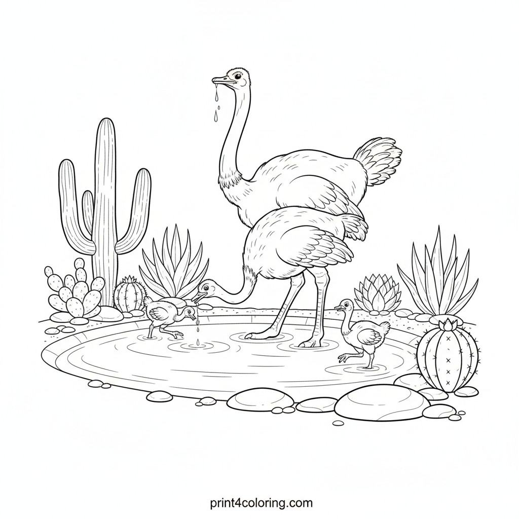 Ostrich Oasis: Family Waterhole Serenity Coloring Page