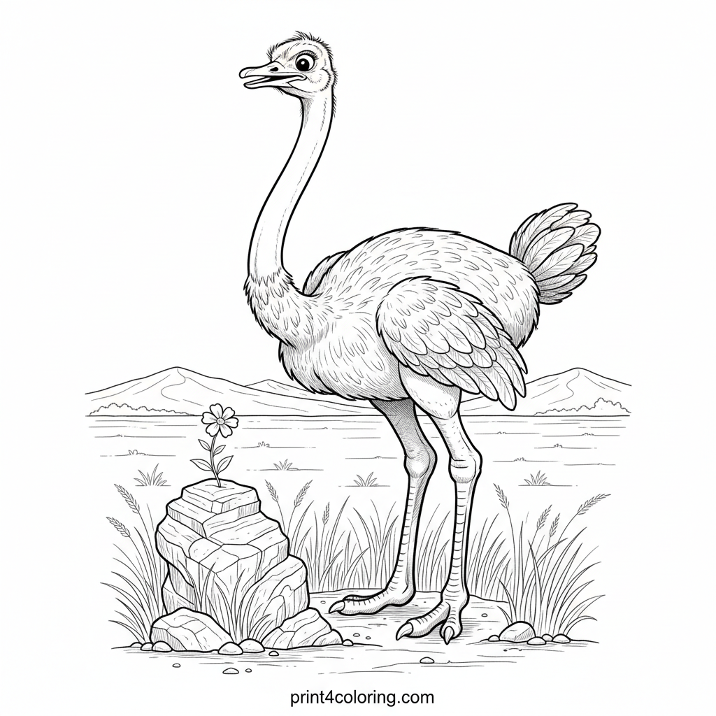 Join our feathered friend, the ostrich, on a comical quest for a tiny, delicious wildflower! Watch its long neck stretch and twist as it tries to reach the bloom atop a detailed rocky perch. This scene invites you to add vibrant colors to the ostrich, the intricate rock, and the resilient little flower.
