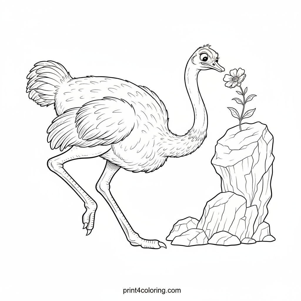 Join a thoughtful ostrich as it comically stretches its impossibly long neck, reaching for a tiny, vibrant wildflower perched high on a detailed rock formation. This expert-level page invites you to bring the desert scene to life, capturing the ostrich's determined quest for a peculiar snack.