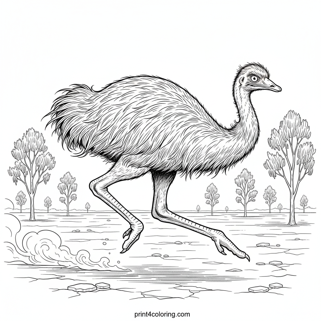 Capture the incredible speed of an emu as it sprints across the vast Australian Outback! This dynamic scene shows the powerful bird in mid-stride, legs extended, with dust subtly rising. Color its detailed feathers and bring the distant eucalyptus trees and clear horizon to life in a truly wild adventure.