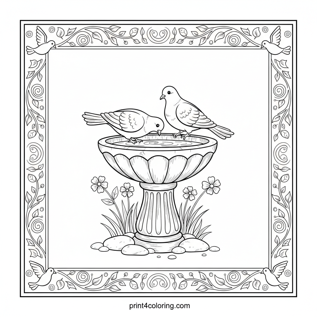 Peaceful Doves at the Garden Bird Bath Coloring Page