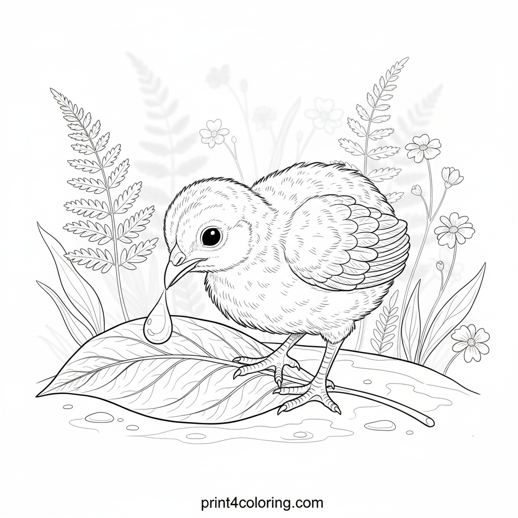 Embark on a charming journey with a fluffy young peachick as it curiously investigates a shimmering dewdrop on a magnificent, intricately veined leaf. Explore the beauty of nature with soft focus ferns and delicate wildflowers in the background, offering a delightful challenge for expert colorists.