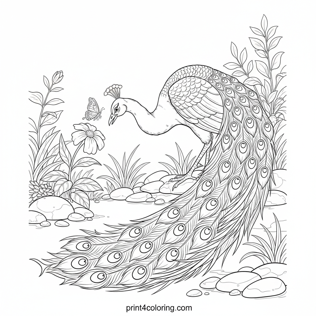 Observe a magnificent peacock with its stunning tail feathers softly lowered, captivated by a delicate butterfly perched on a vibrant flower. This intricate scene captures a moment of gentle curiosity in a lush garden, complete with detailed plants and natural rocks. A beautiful challenge for expert colorists!