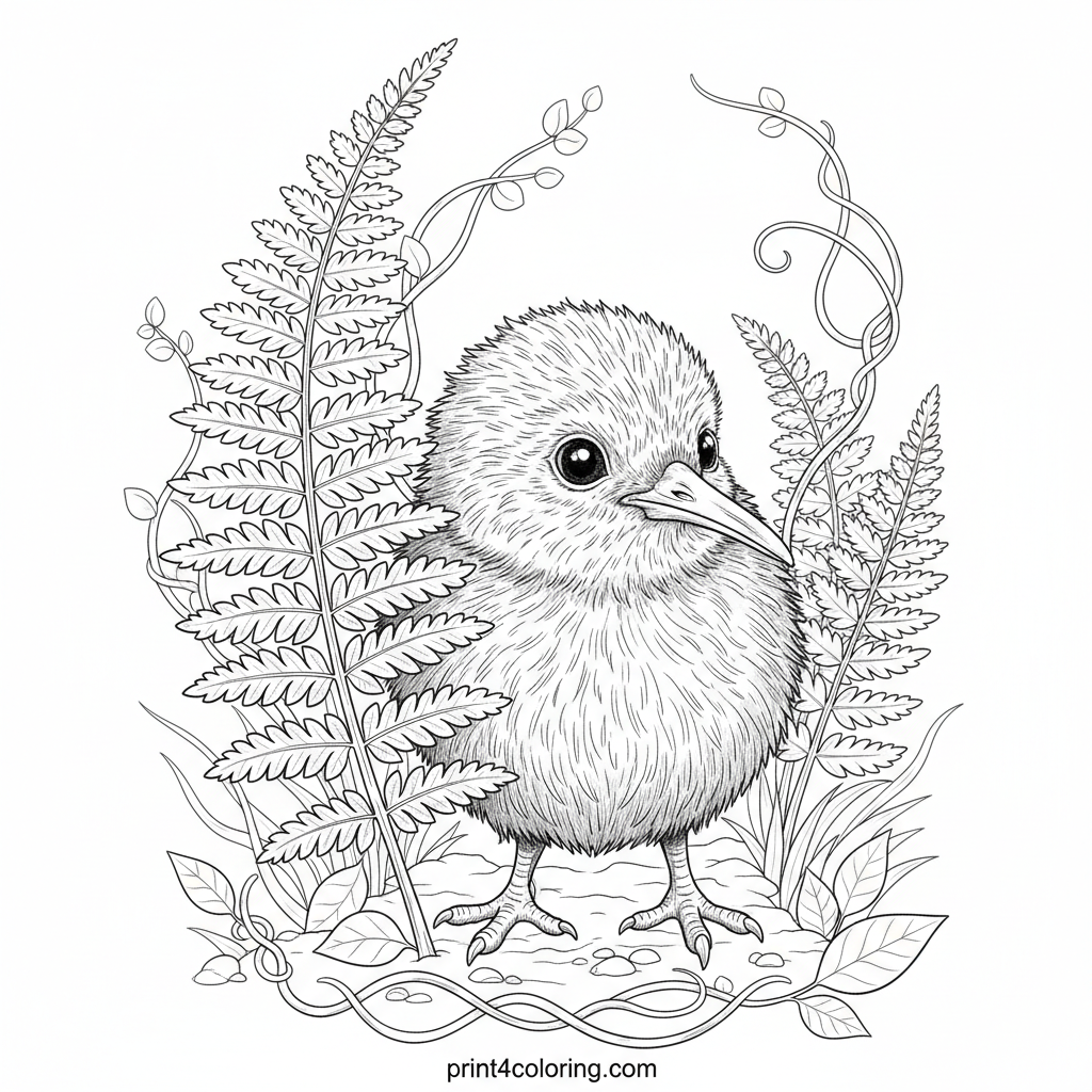 #kiwi#baby kiwi#new zealand#bird#fern#forest#nature#wildlife#coloring-page#printable
