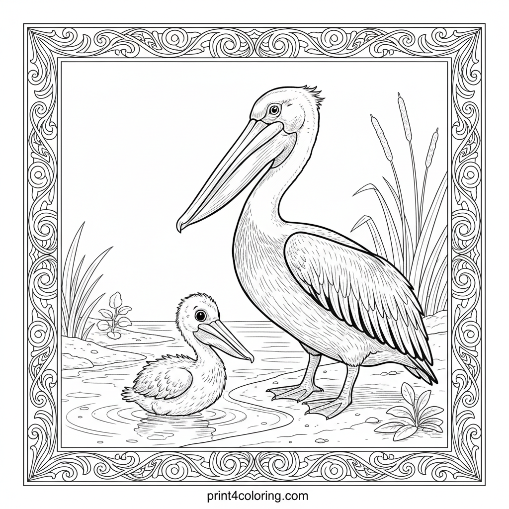 Dive into the heartwarming scene of a fluffy baby pelican taking its very first swim! With wide, curious eyes, this little chick gently paddles in clear, shallow water while a watchful adult pelican stands nearby. Intricate details like feathers, reeds, and water ripples await your expert coloring touch in this delightful lesson.