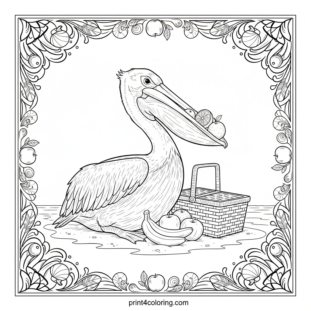 A friendly pelican enjoys a sunny beach picnic, its large pouch playfully full of colorful fruits peeking from a charming, old-fashioned basket. Intricate wicker patterns and individual feathers offer delightful detail, inviting you to bring this vibrant seaside scene to life with your favorite colors.