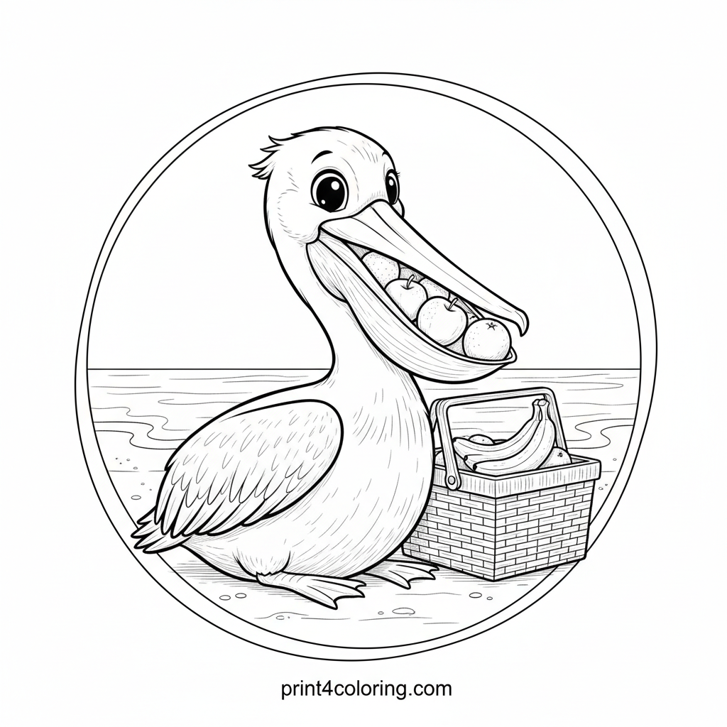 Imagine a friendly pelican enjoying a sunny beach day! Its big pouch is full of colorful fruits from a charming picnic basket. Detail the wicker, the pelican's feathers, and the gentle beach background. A delightful scene perfect for mindful coloring and a touch of summer fun.