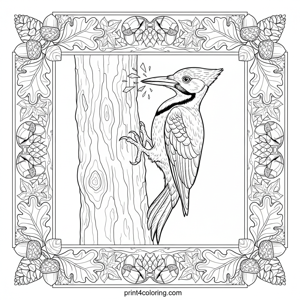 Witness the magnificent Pileated Woodpecker performing its energetic 'drum solo' deep in the forest! This expert coloring page captures the bird mid-strike, its powerful beak chiseling into an old tree trunk, sending tiny wood chips flying. Focus on the intricate feather details and strong claws. A challenging and rewarding scene for expert colorists.