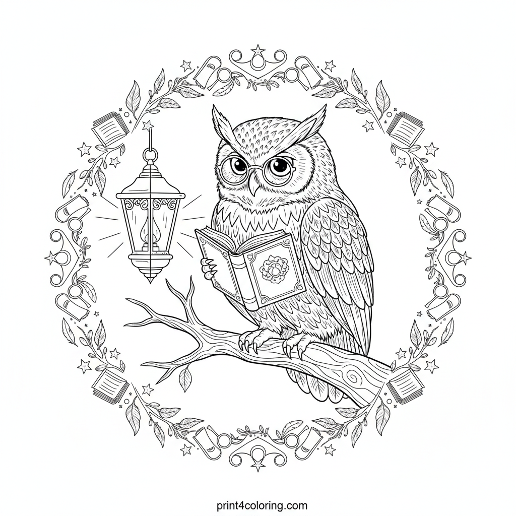 Delight in coloring Professor Hoot, the wise great horned owl, as he enjoys a good book! Perched on a textured branch, wearing tiny spectacles, he's deep in thought beside an antique lantern. This intricate scene offers a wonderful challenge to bring wisdom and warmth to life with your favorite colors.
