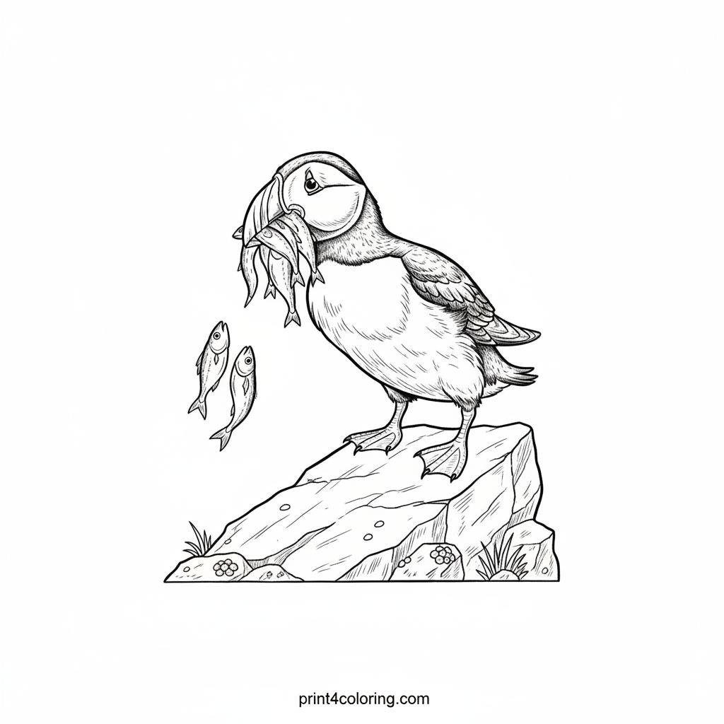 Join this determined puffin as it attempts an amazing balancing act! Perched on a rugged rock, it's trying to hold a beak-full of shimmering fish, but some look like they might slide away. Can you help this plucky bird by bringing its tricky situation to life with vibrant colors?