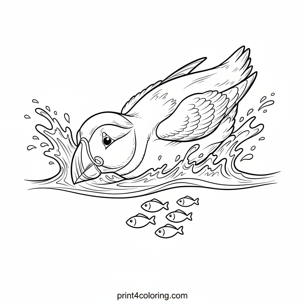 Dive into the vibrant world of the Atlantic Puffin! This detailed coloring page captures a puffin mid-hunt, sleekly plunging into the ocean with wings tucked back, ready to catch a school of tiny fish. Observe the dynamic water splashes and imagine the cool, clear water. A thrilling scene for aspiring marine biologists!