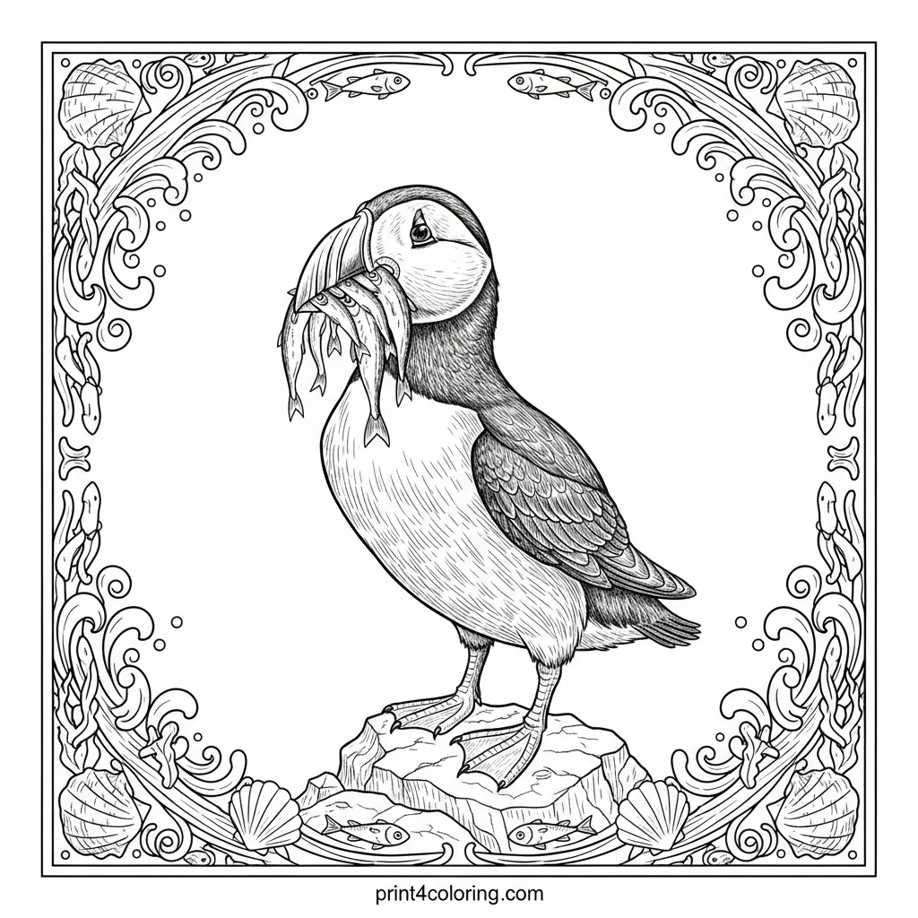 #puffin#bird#ocean#fish#balancing-act#nature#wildlife#sea-bird#detailed#expert#coloring-page#printable