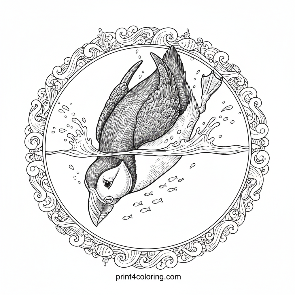 Experience the thrill of a puffin's underwater hunt! This expert-level coloring page captures a sleek puffin diving headfirst into the clear ocean, wings tucked back, with a shimmering school of fish just below. Intricate water splashes add dynamic motion to this exciting marine scene, perfect for detailed coloring.